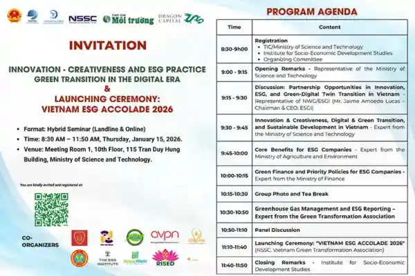 As Vietnam accelerates innovation, digital transformation, and green transition in alignment with sustainable development commitments, ESG (Environmental, Social, and Governance) has emerged as a central strategic framework. It now dictates policy directions, capital flows, and corporate competitiveness, particularly within global value chains. In response to increasing requirements for emissions reductions, data transparency, and sustainability reporting, the Organizing Committee cordially invites representatives from enterprises, organizations, and individuals to attend INNOVATION – CREATIVENESS AND ESG PRACTICE| GREEN TRANSITION IN THE DIGITAL ERA & LAUNCHING CEREMONY: VIETNAM ESG ACCOLADE 2026