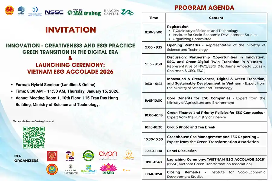 Co-organizers & Partners: National Startup Support Center (NSSC) – Agency for Technology Entrepreneurship and Commercialization Development (NATEC); Vietnam Green Transformation Association (VGTA); Institute for Socio-Economic Development Research; Environment Magazine; Dragon Capital; Viet Hoi Nhap Company; ESG Institute; and various strategic partners.